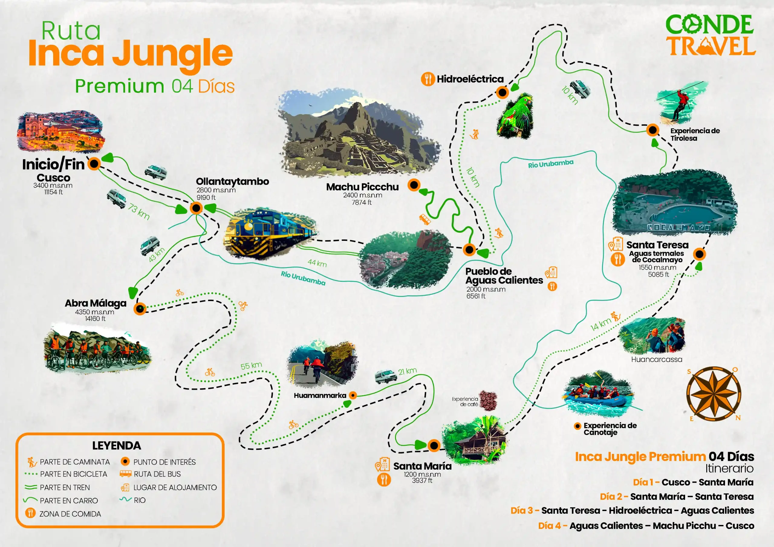 Inca Jungle Premium es un tour alternativo de 4 días diseñado para los amantes de la aventura, la historia y la naturaleza. A lo largo de este emocionante recorrido, disfrutarás de actividades como canotaje, caminata, bicicleta y tirolesa, todo mientras exploras un entorno natural único.
