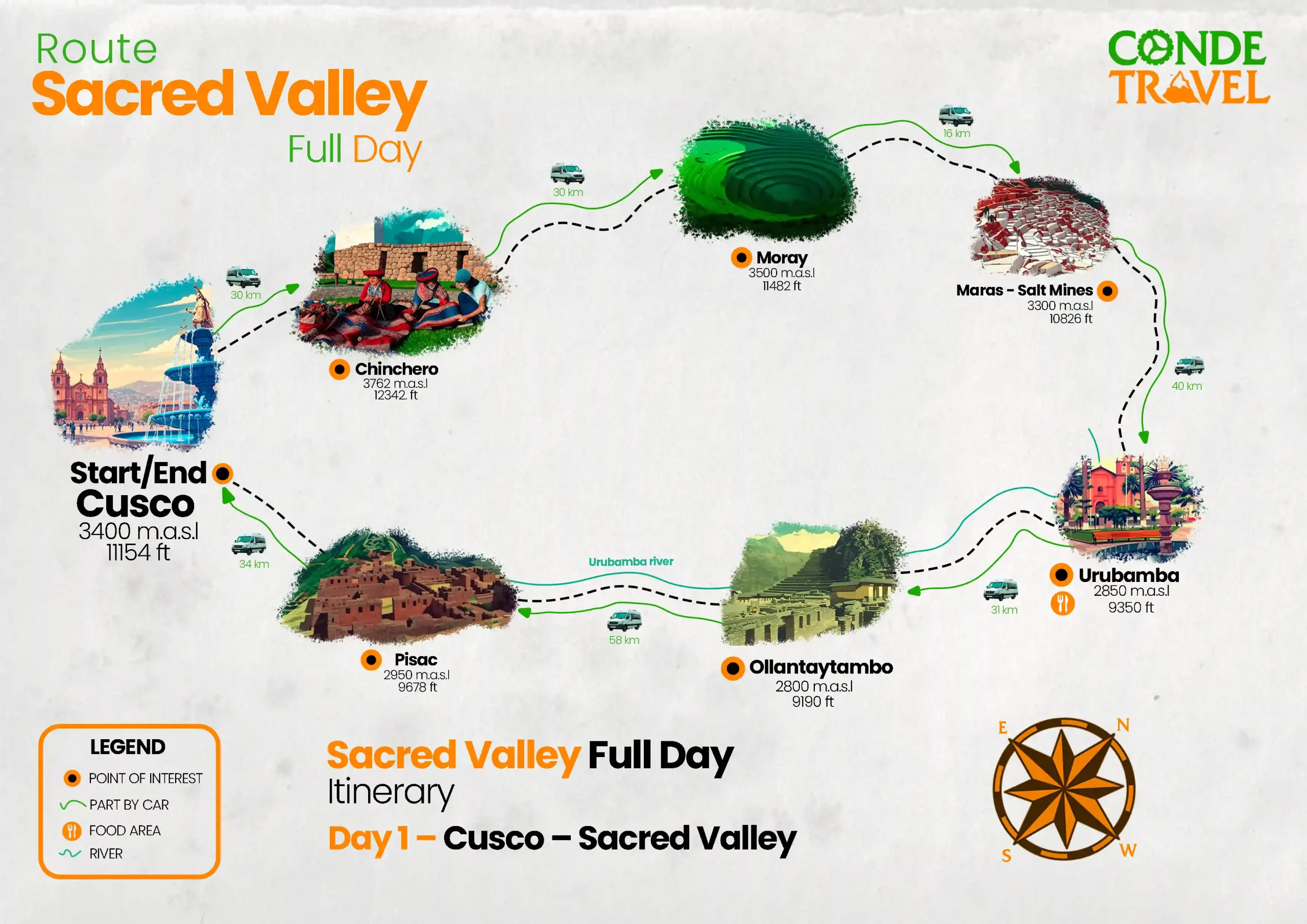 We will pick you up between 6:45 am – 7:00 am from your hotel, heading towards the Sacred Valley, where we will visit 4 archaeological zones.